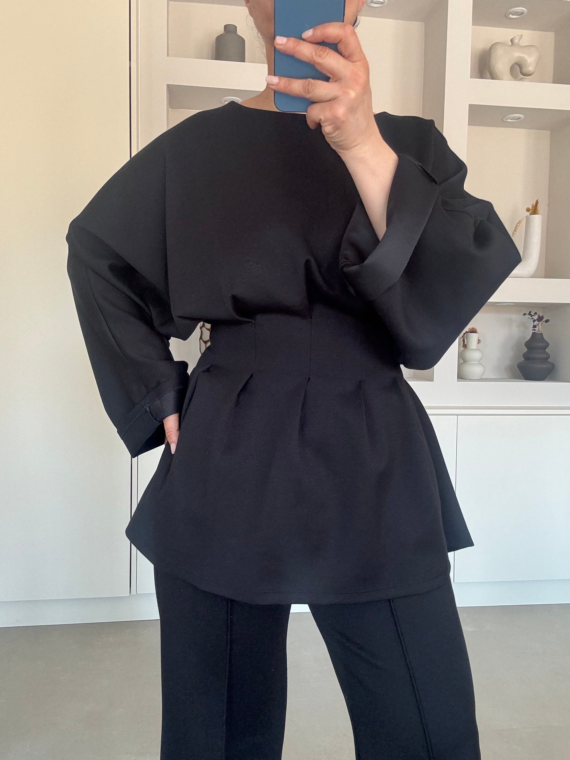 Tweedelige set met een top met strikceintuur en een rechte broek. De stof heeft lichte stretch en zorgt voor een comfortabele fit. Makkelijk als complete outfit te dragen. Binnenbeen lengte 74 cm