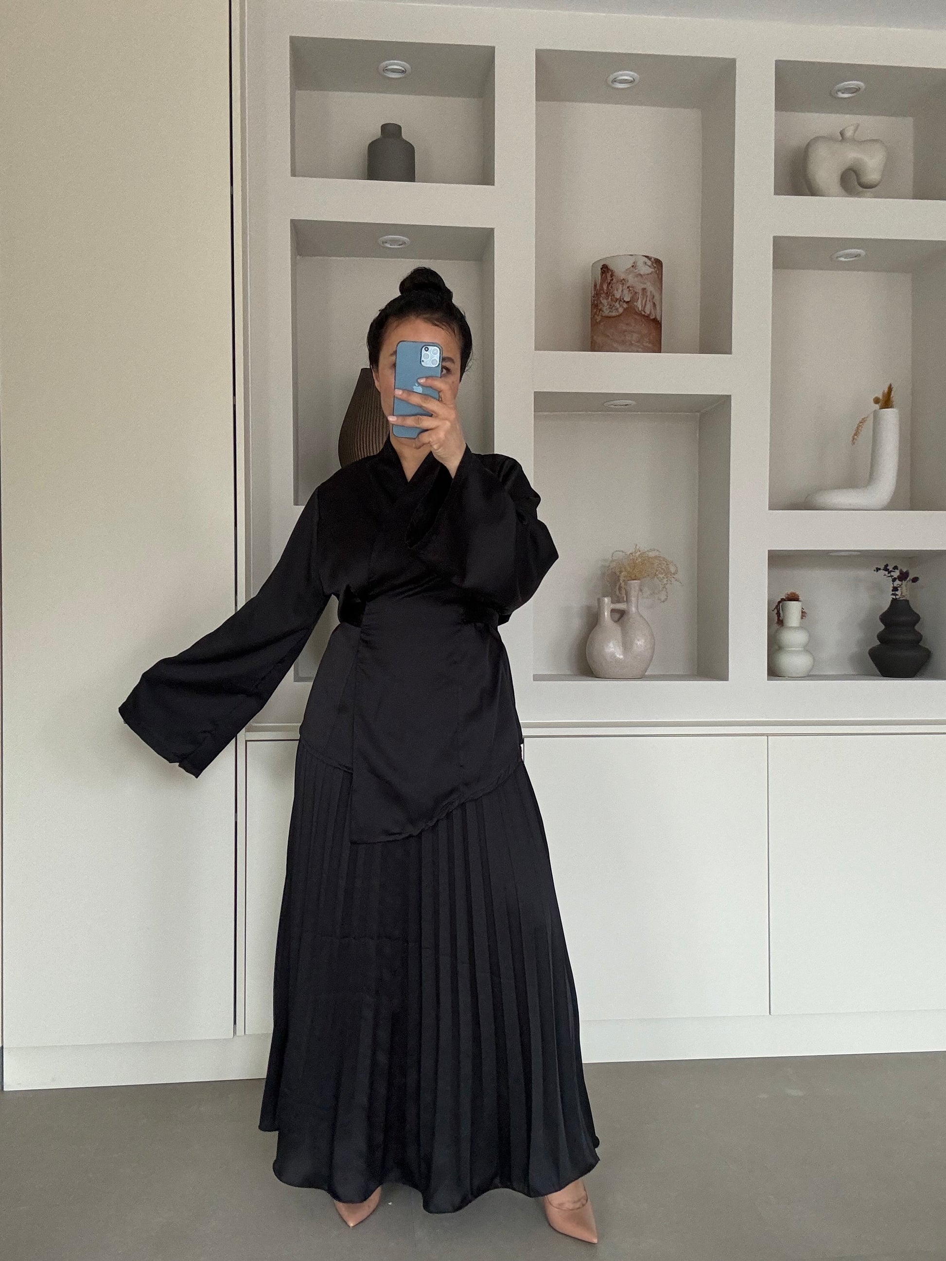 Elegante tweedelige set in een diepe zwarte tint. De top heeft een verfijnde overslag met subtiele taille-accentuering voor een vrouwelijke en luxe uitstraling. De rok valt soepel en creëert een sierlijk silhouet bij iedere beweging.