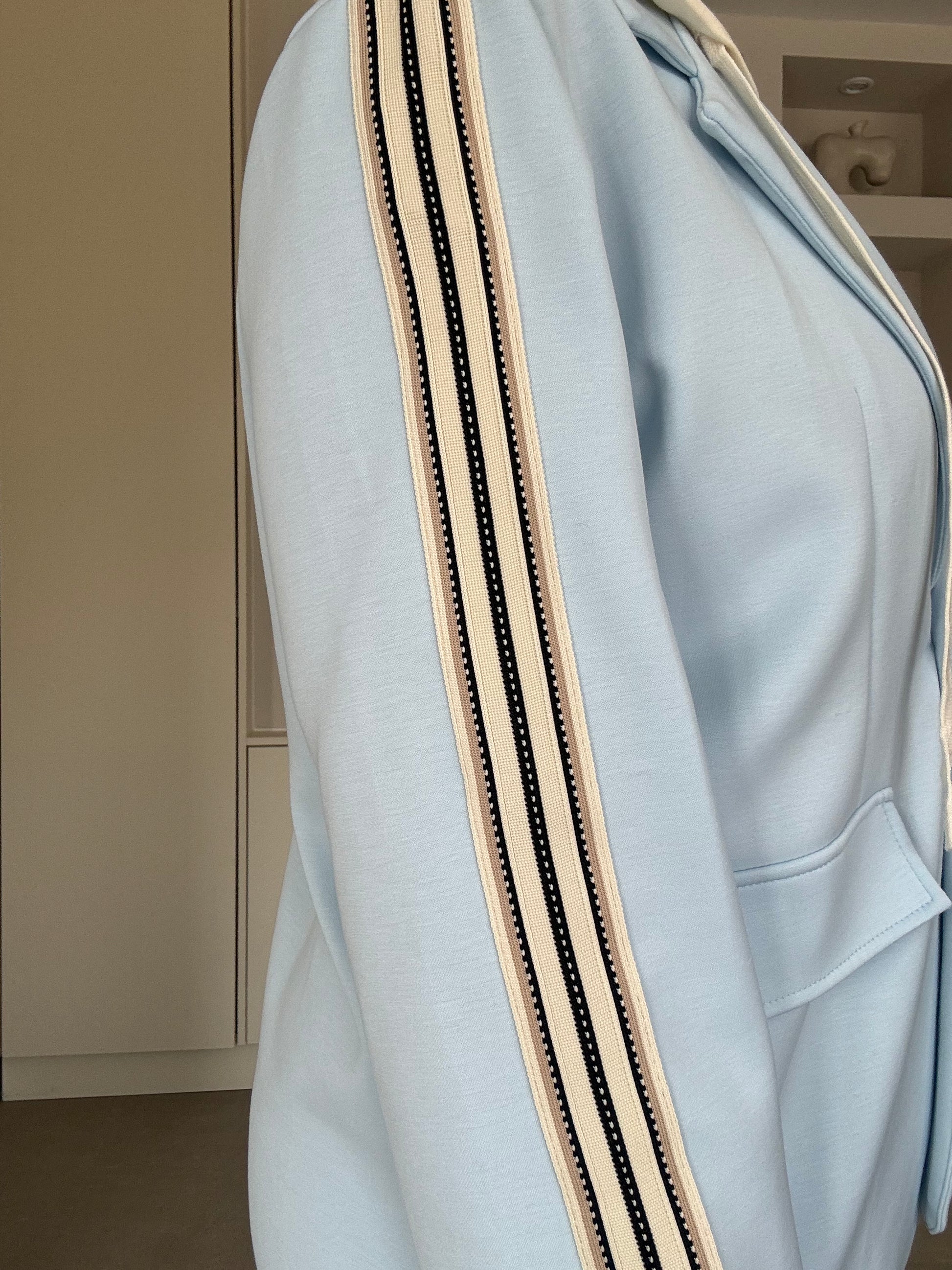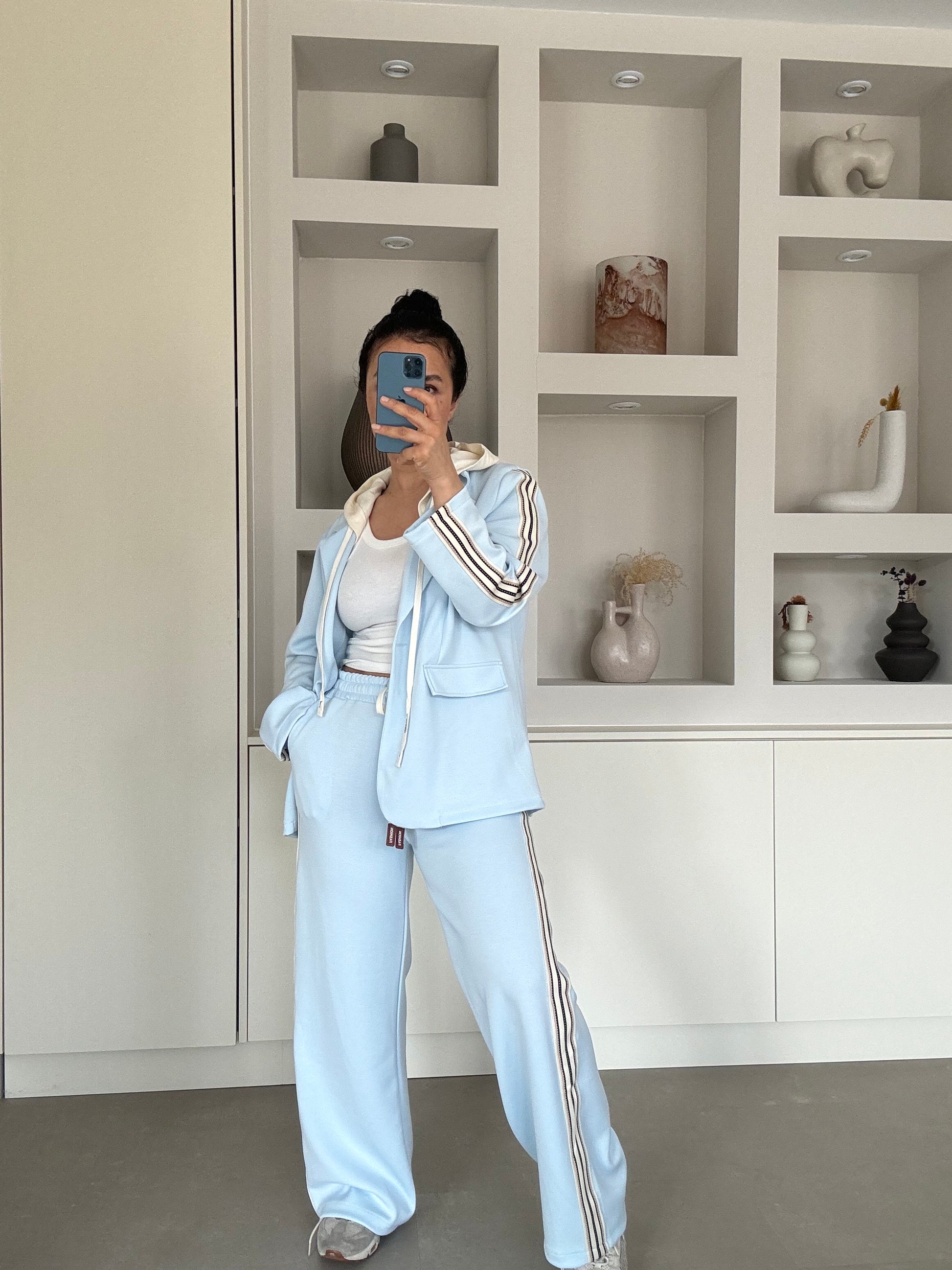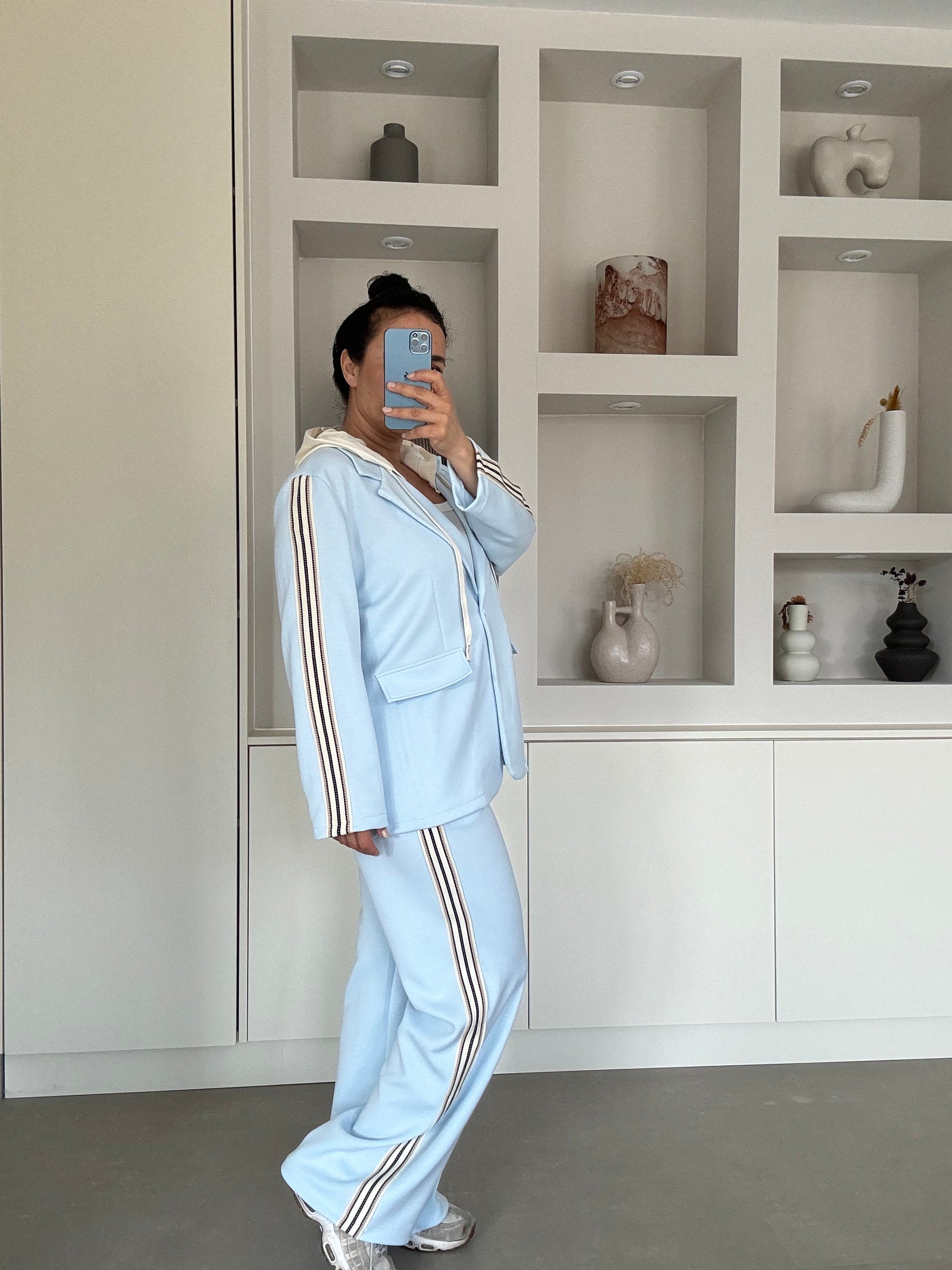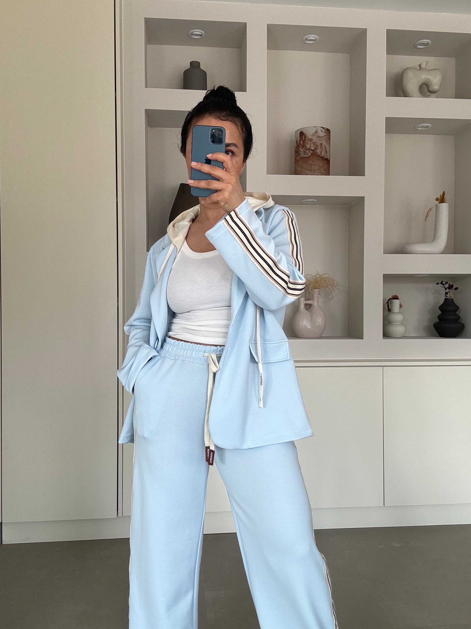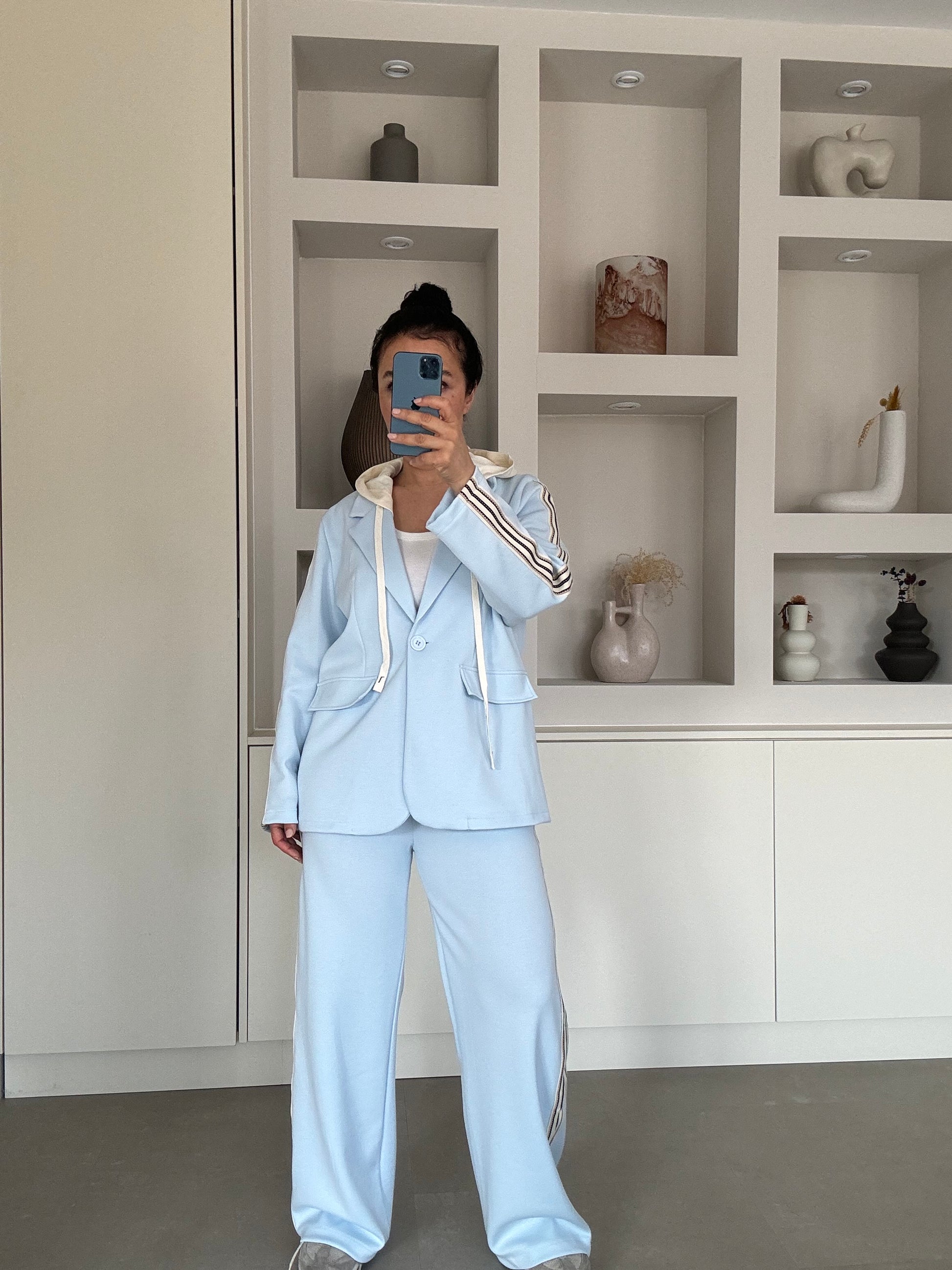 Stijlvolle blauwe set met blazerlook en afneembare capuchon voor een sportieve twist.