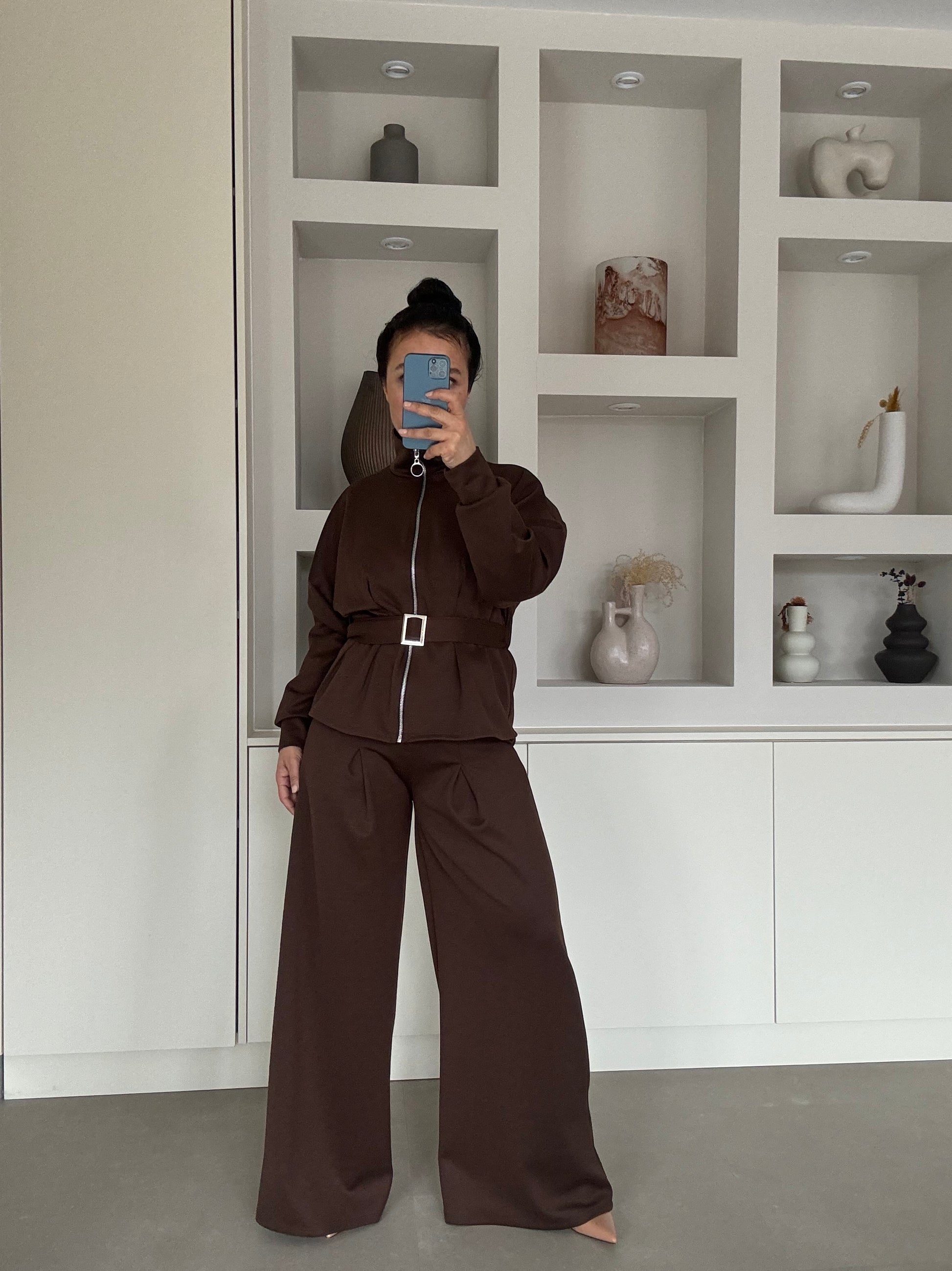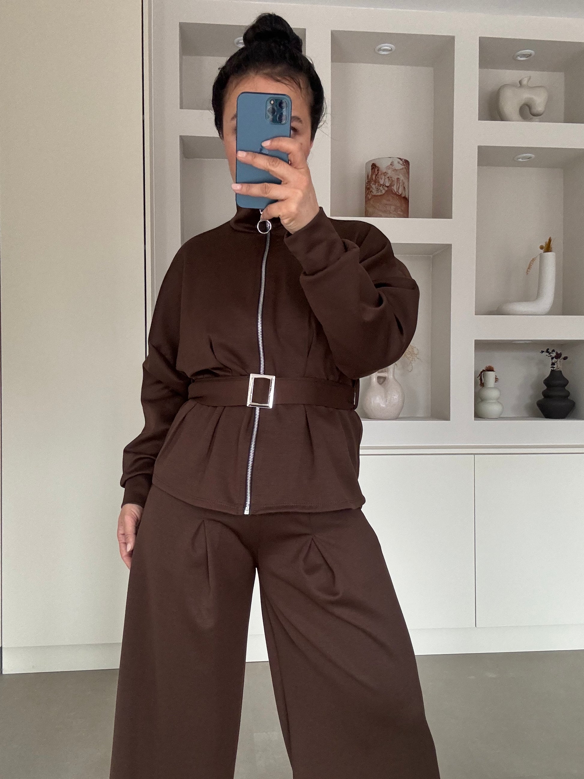 Stijlvolle bruine set met ritssluiting en bijpassende tailleceintuur voor een elegante fit.