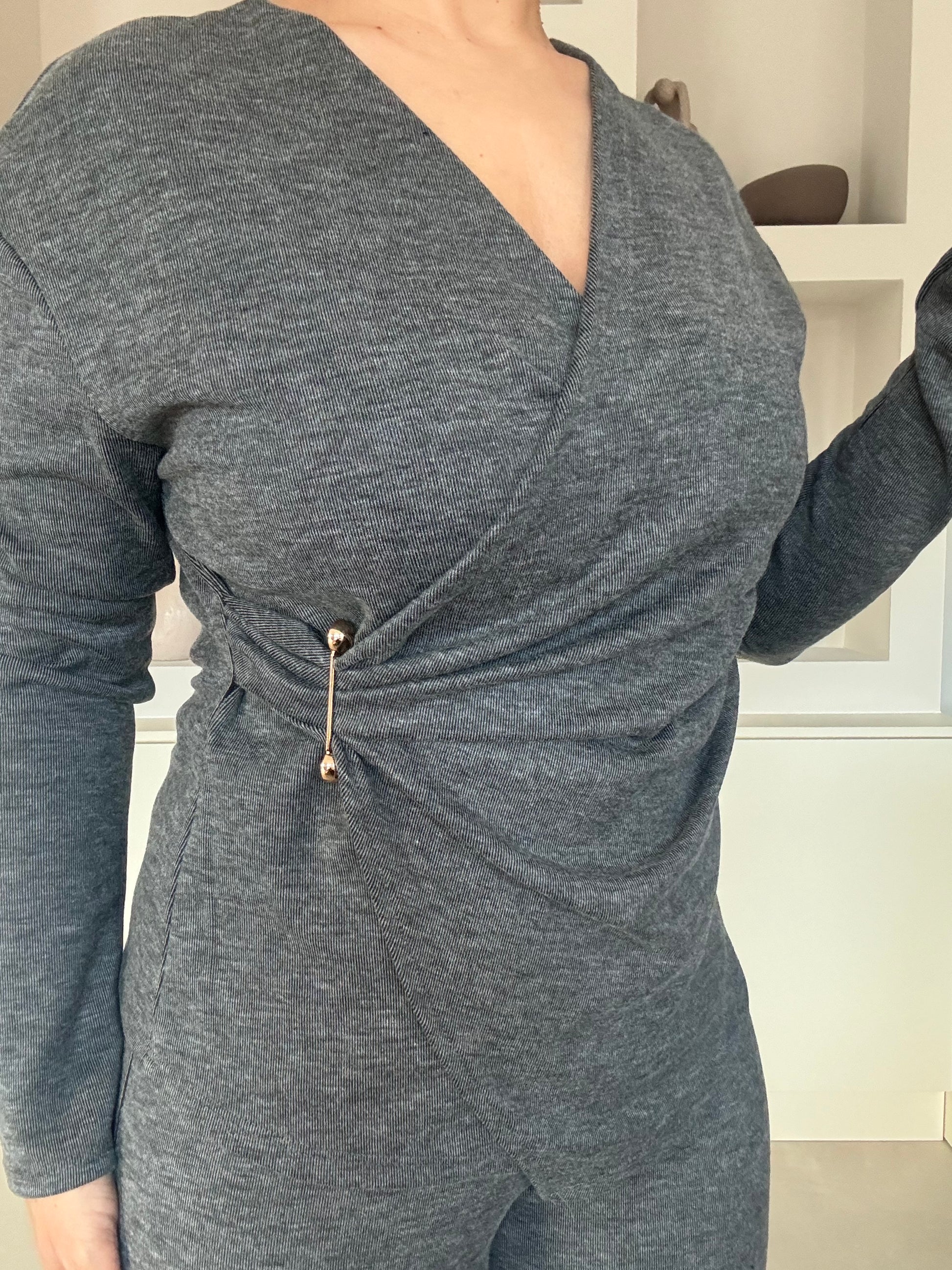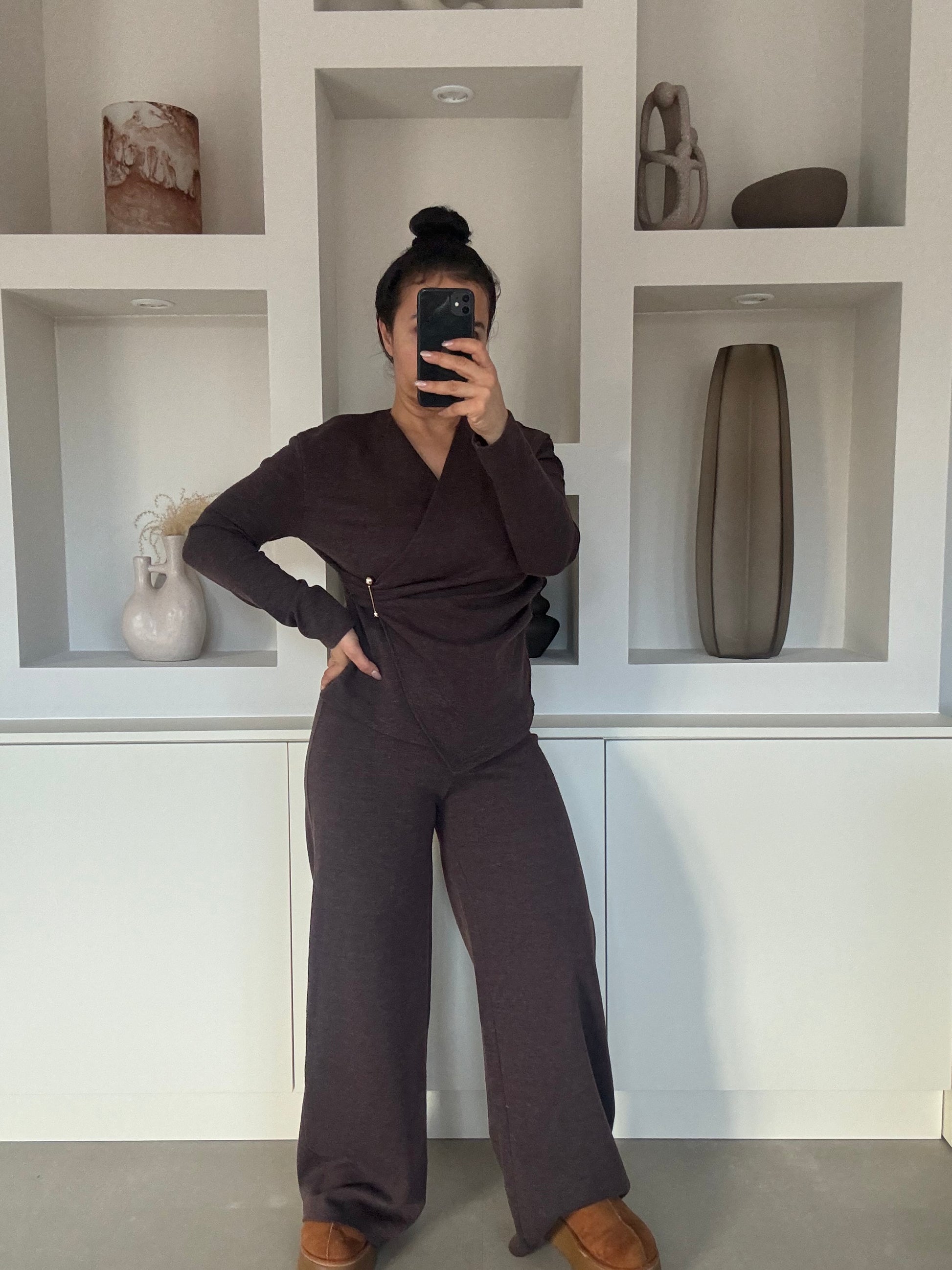 Deze elegante set met wide-leg broek straalt klasse en comfort uit. De vrouwelijke top in combinatie met de soepelvallende broek zorgt voor een tijdloze en stijlvolle look die je zowel casual als chic kunt dragen. De set voelt zacht aan, beweegt mooi mee en is perfect voor het najaar en de winter.