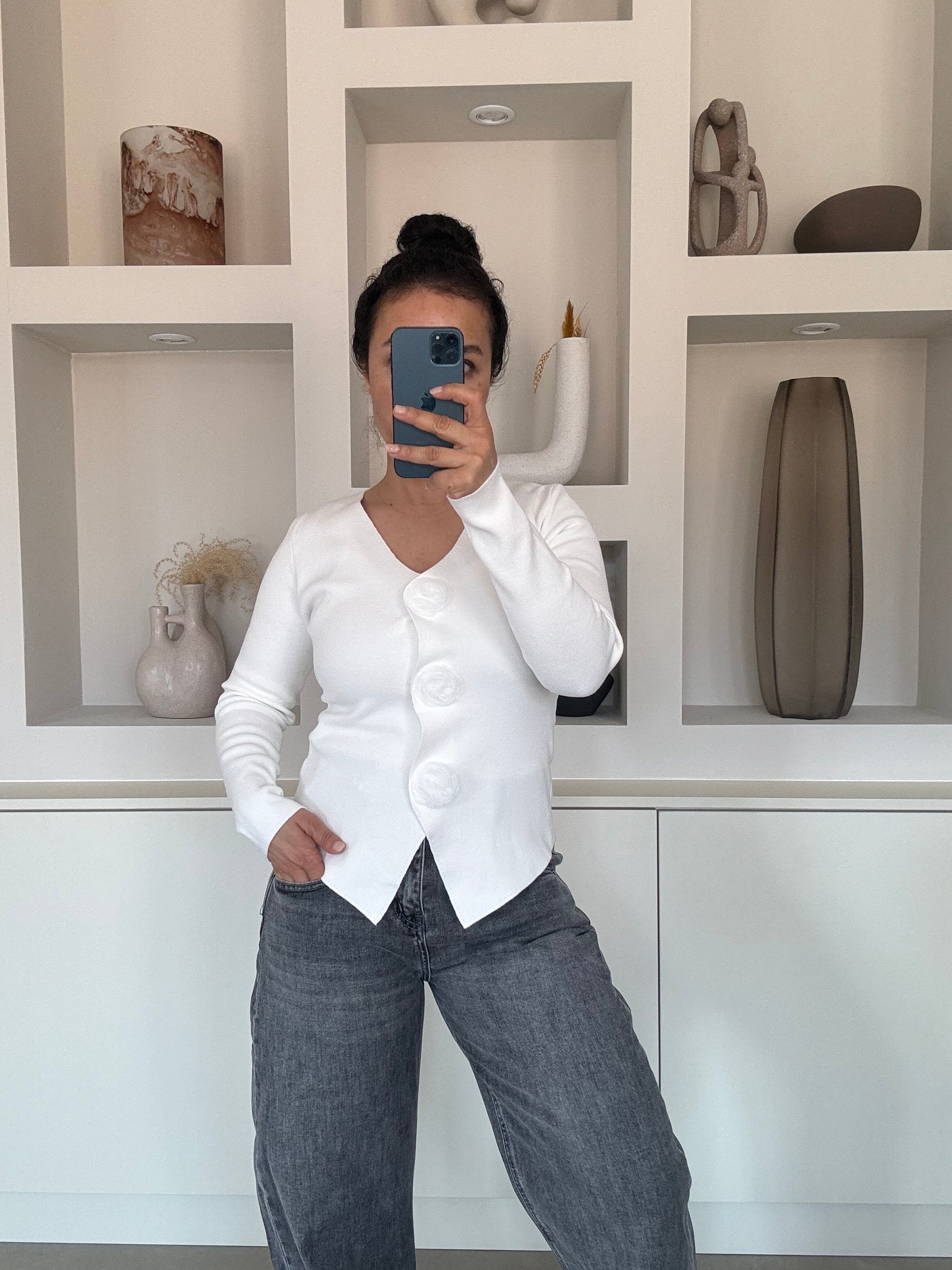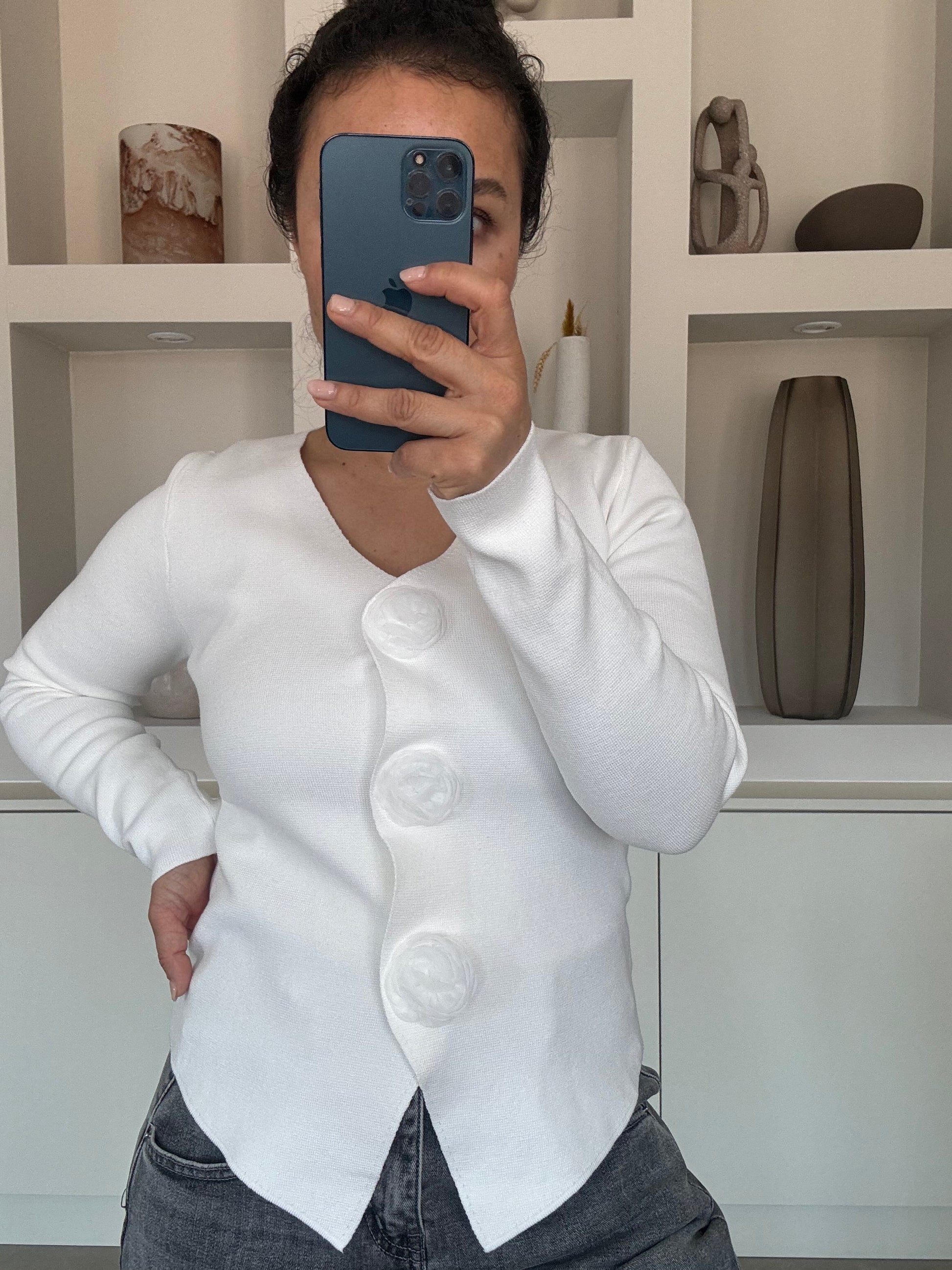 Witte top met opvallende flower details aan de voorkant. De zachte stretch stof zorgt voor een comfortabele fit en maakt de top makkelijk te combineren met een jeans of pantalon.
