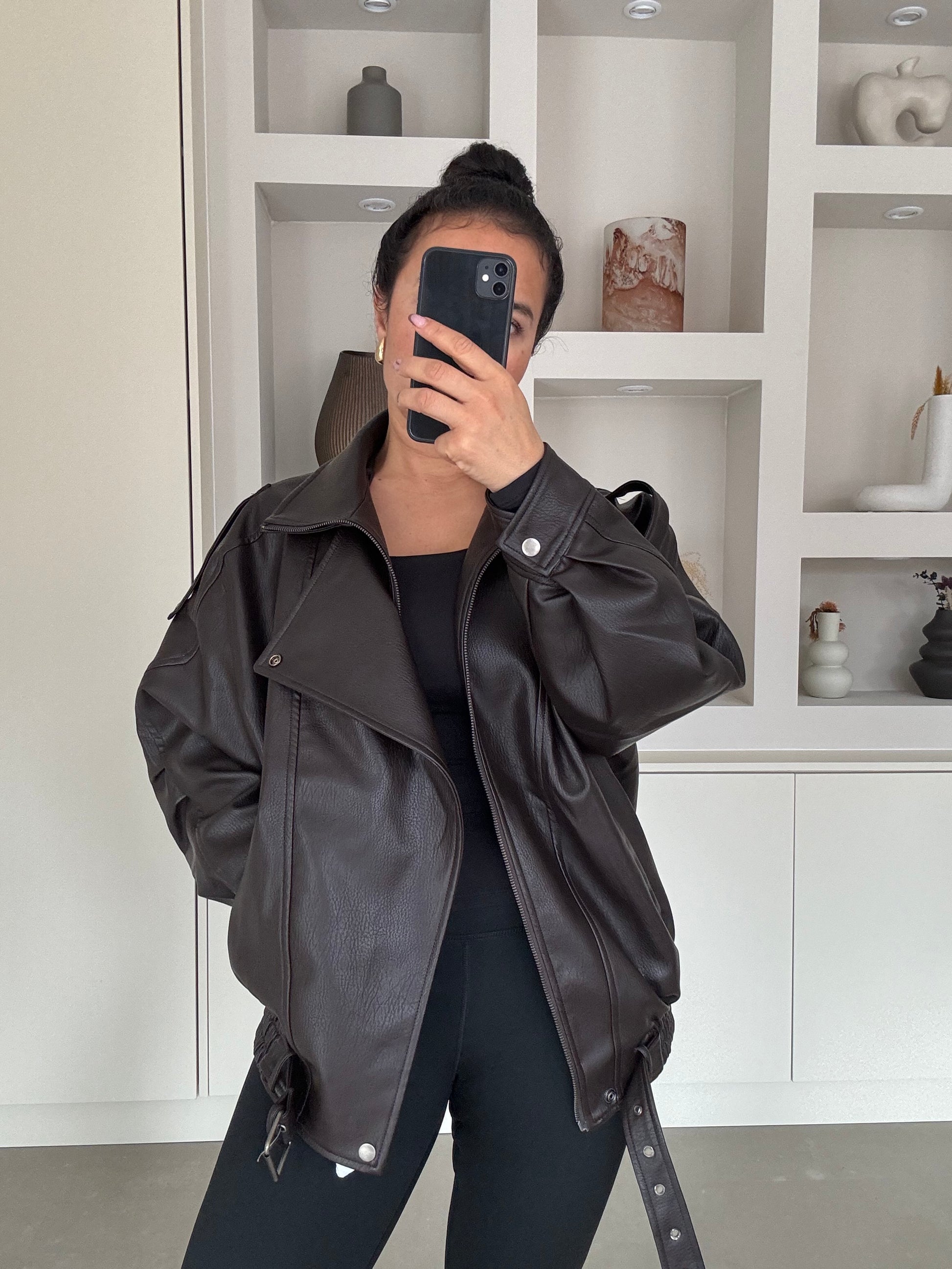 De Milano Leather Jacket is het ultieme statement item voor elke look. Gemaakt van 50% echt leer en 50% polyester — soepel, duurzaam en met die luxe uitstraling die nooit uit de mode raakt. De oversized fit geeft een effortless silhouette dat zowel stoer als vrouwelijk aanvoelt. Combineer met een strakke legging of jeans voor een stijlvolle, easy-going vibe.